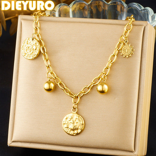Chunky Gold Chain Necklace with Coin & Bead Charms