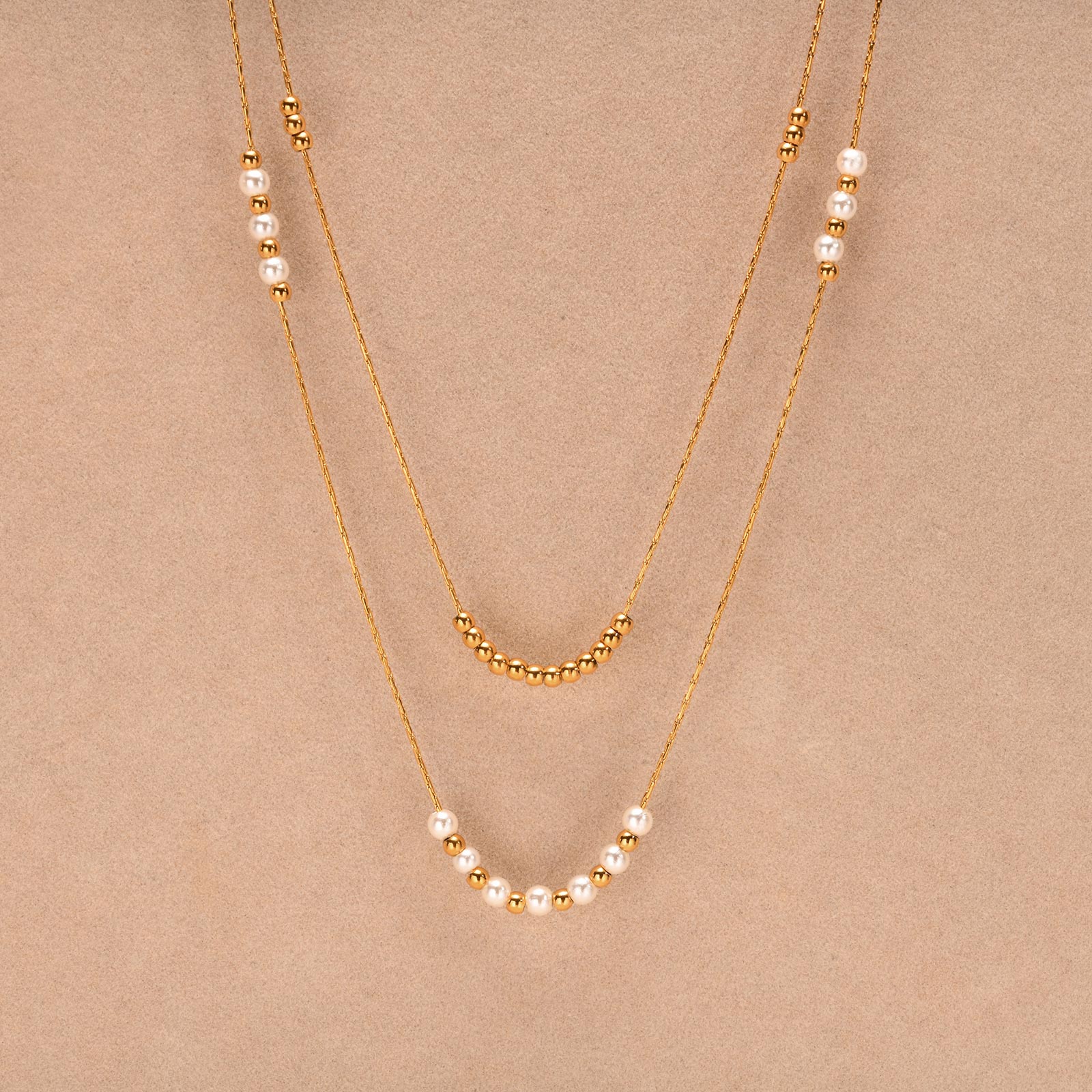 2pc Dainty Pearl and Gold Bead Necklace Set