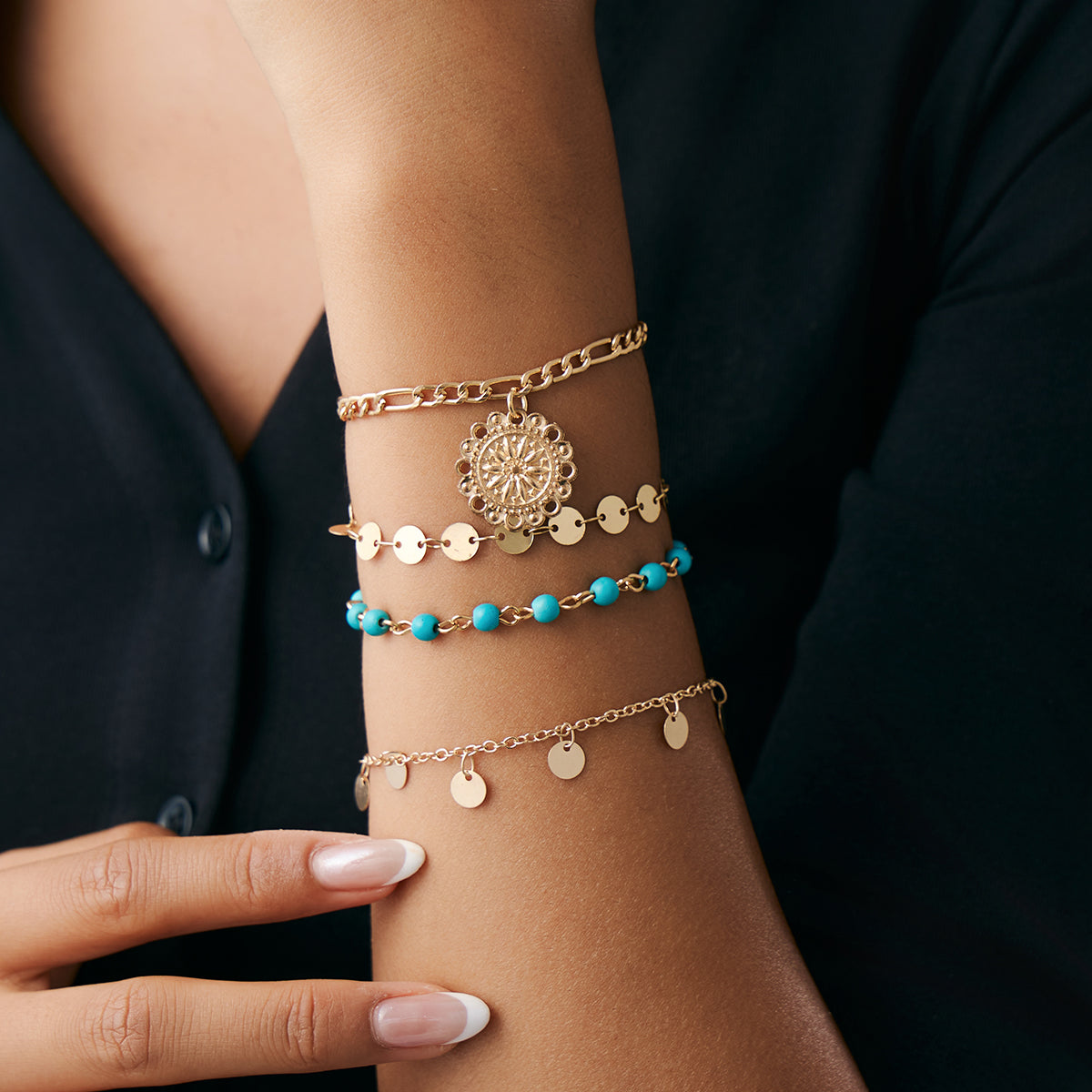 4pc Vintage Sequin & Sun Pendant Bracelet Set